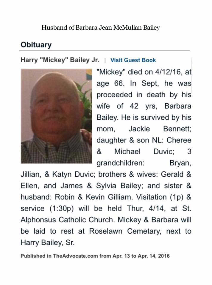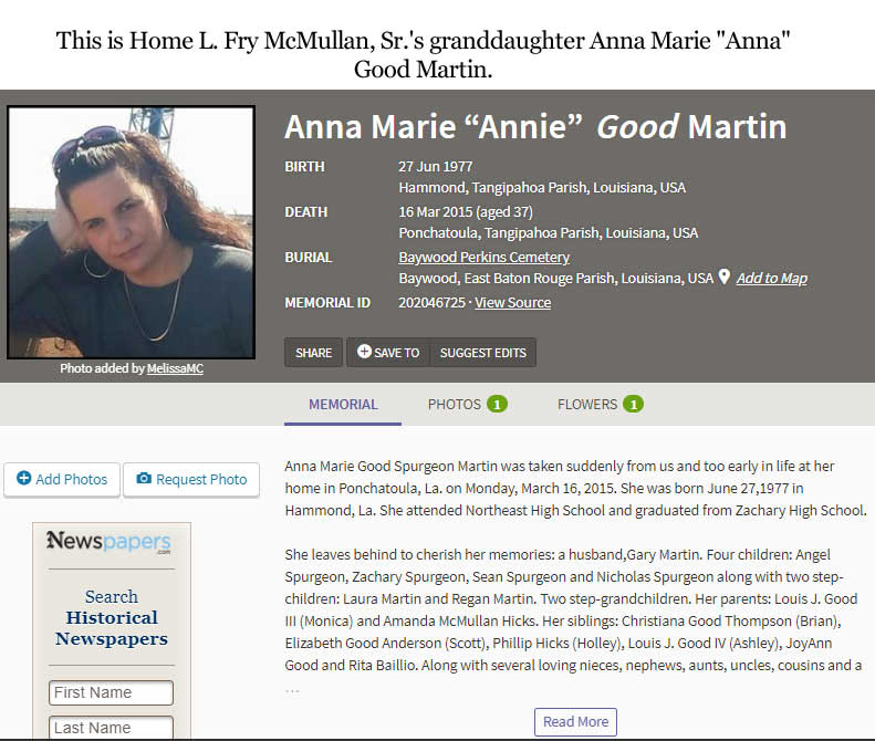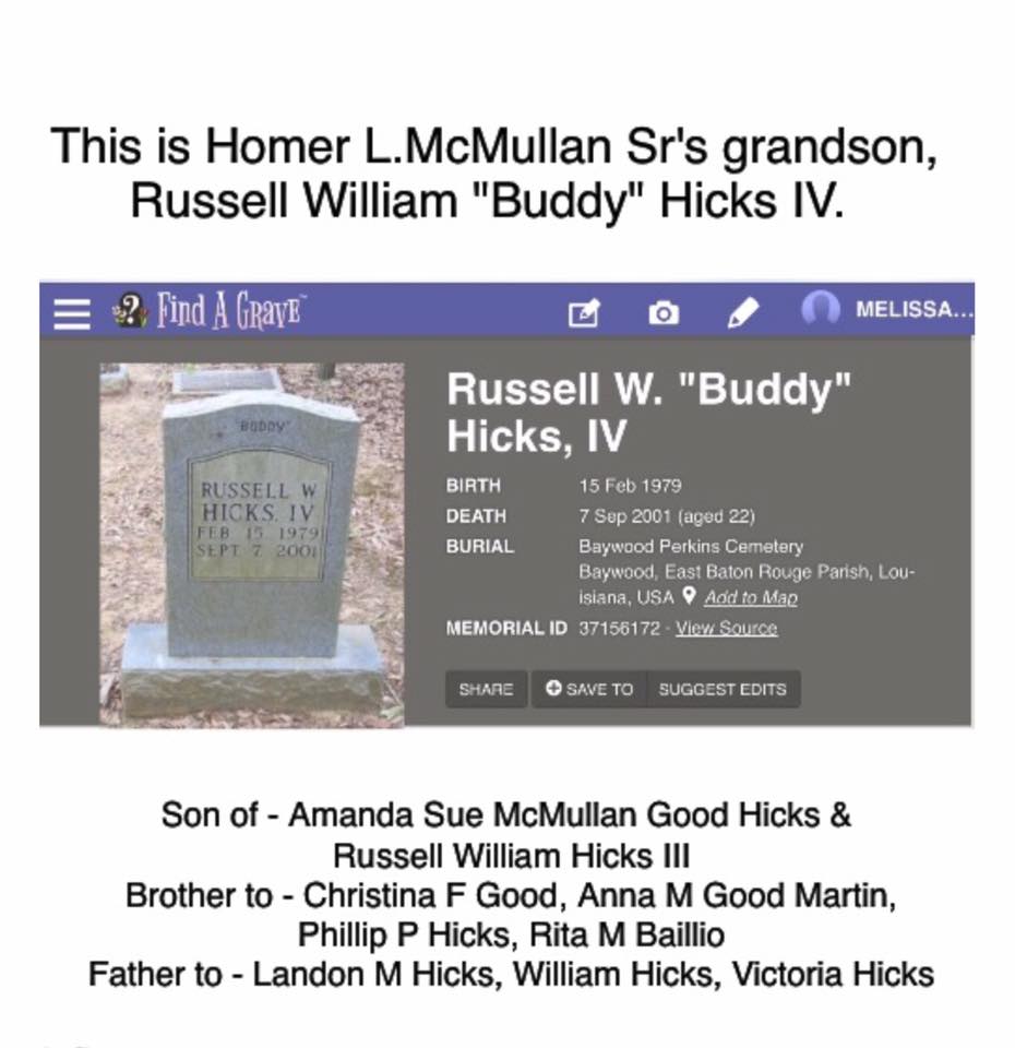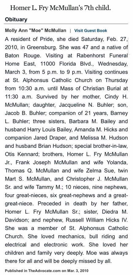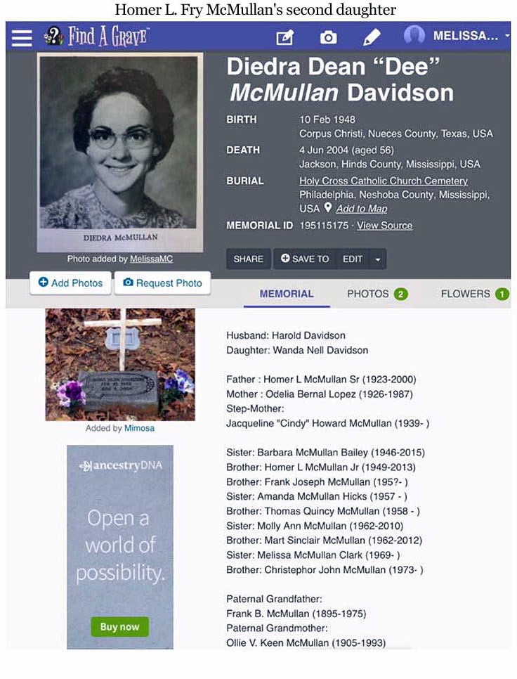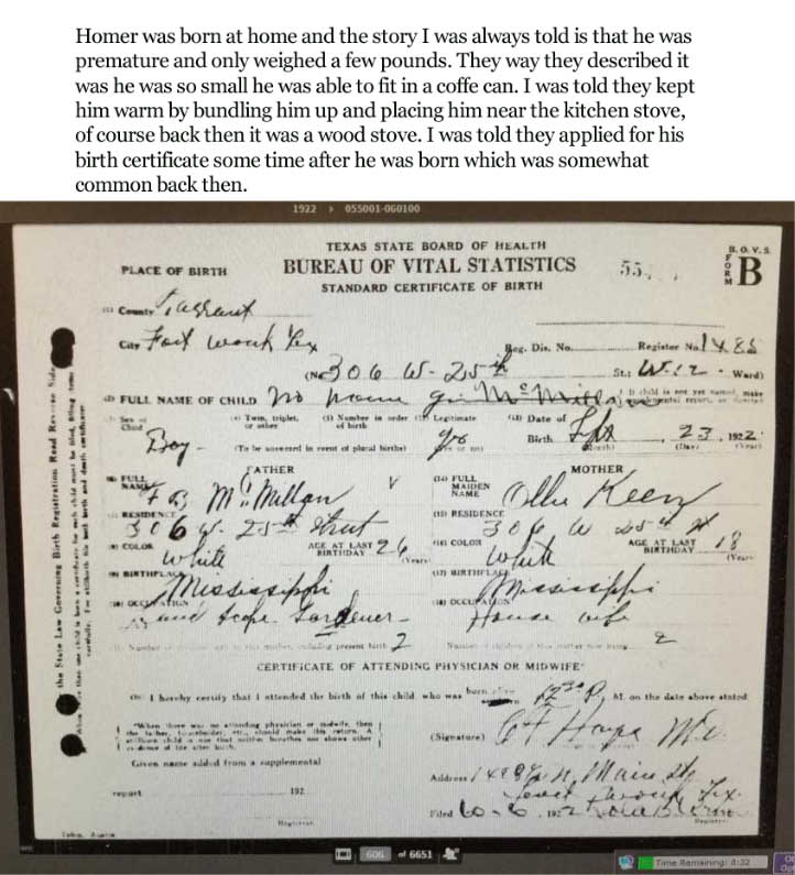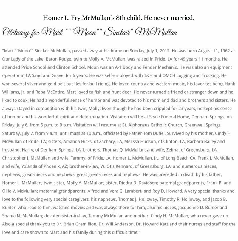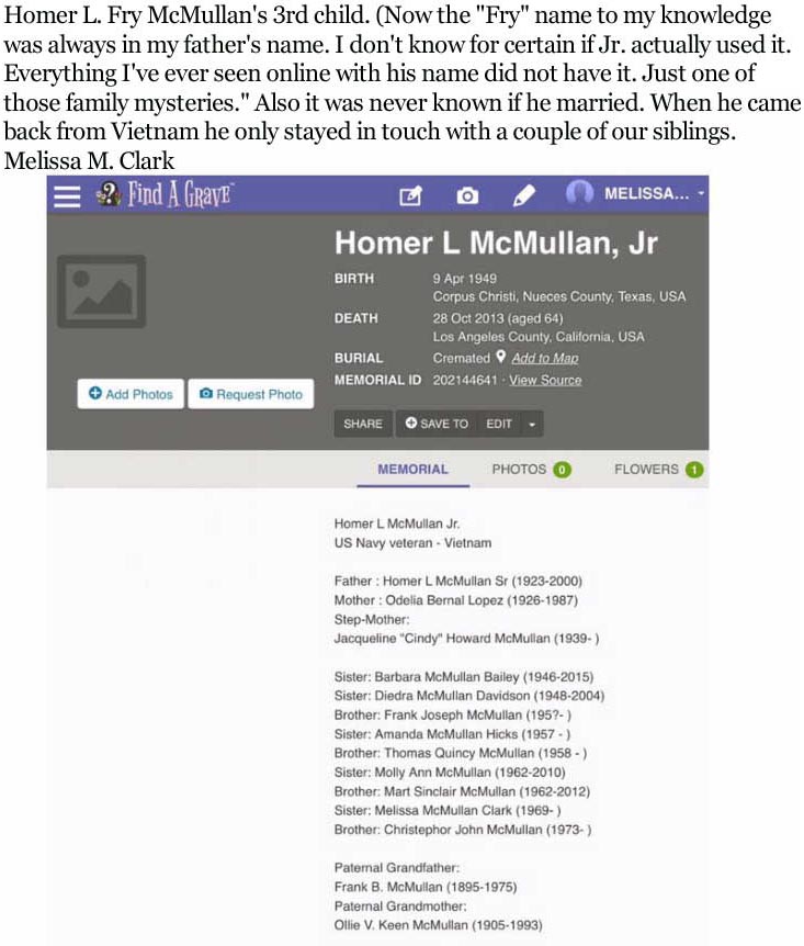 Homer L. Fry McMullan was born to Frank Burkett and Ollie McMullan if Ft. Worth, Texas. He was married first to Odell Burnell and four children with her; Barbara Jean, Diedra Dean "Dee", Homer L. Jr., Frank Joseph. Later, he married Jacqueline "Cindy" Howard and had five children with her; Amanda Sue, Thomas Quincy, Mart Sinclair, Melissa Marie and Christopher John.