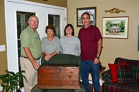 While in Hartwell, we met with Kay Cleveland and Jim McMullan and his wife Rosalind. Jim and Kay took us to look at graves at New Prospect Baptist Church and Northview cemetery in Hartwell. Shannon, Lori and I went out to John's grave and took photos with the trunk at his grave. We also got photos of the trunk at John's grave and at Kay's house with everyone.