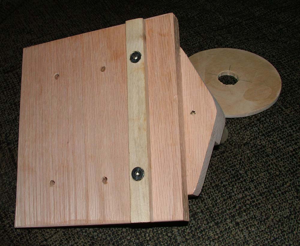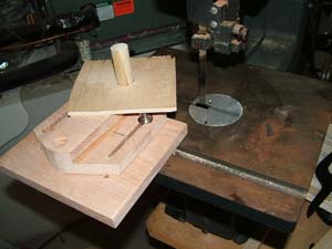 I made a circle cutting jig for my bandsaw. It will cut various sized holes by moving the slide in and out and using machine screws with wing nuts to lock it in place. I will need to make about 25 5" disks with a 1" center hole so I needed something to make my life easier. I will cut a square of 3/4" plywood approximately 5 1/4" square and drill a 1" center hole. Then I will place the square over the 1" plug while the jig is in place and then just spin the wood square to cut even disks. The jig can also ba used with a 3/4" plug. By using different mounting holes, various size disks can be cut. |