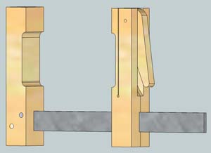 Here is a drawing made in Google Sketchup of a cam clamp. Click to download the Sketchup file. |
