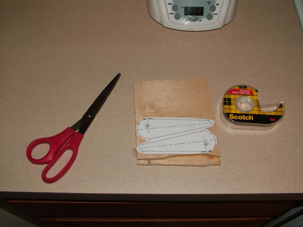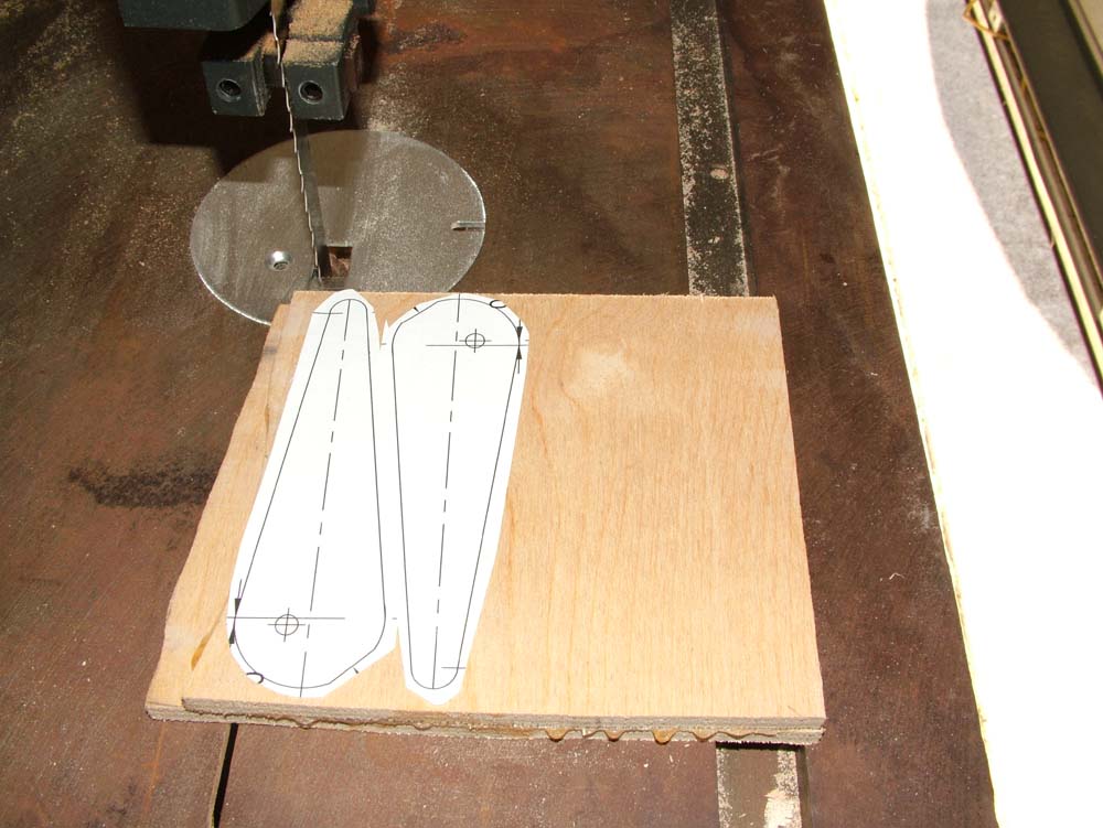 To make the cams, I glue two pieces of 1/4" ply together. After they dry, I use double sided tape and glue a full size pattern to the ply. |