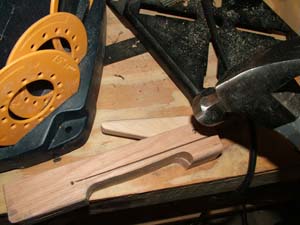 When I cut my first wood for a cam clamp, the alignment on my bench was off by quite a bit. The back of the saw blade sat off from the front of the blade by about 1/4 inch. Needless to say, that didn't make for very good cuts. I was able to clean the wood up enough that I can use the blocks and make a clamp. Now that I have my saw set up, the other clamps will look much better. In Figure 1, you can see how the clamp will push the tang on the block to fasten the clamp.
