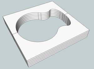 I couldn't sleep last night so I thought out all of the above and drew it on the computer and this afternoon, I got out in the garage and wanted to begin building the guitar mold. I ordered the wood for the back and sides of my guitar and it will be here soon. I want to be able to get started on it as soon as I get the wood and I need to have the mold ready. I wasn't sure exactly how to use the brass router inlay kit and as I looked at it, I realized that the Lexan router base I built a few weeks ago would not work. I cut a hole in the bottom that the large round piece on the inlay kit would go all the way through. Instead of that, the large round piece has a screw on part and that all has to screw onto the router base. So, I cut another piece of Lexan and drilled a one inch hole in the center. The large piece of the router inlay kit needs a hole just slightly larger than 1" so I used my spindle sander to enlarge the hole. This worked out very well.