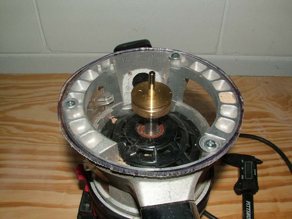The solid brass inlay kit installed in the home made Lexan router base. The alignment pin is in the large part of the inlay kit. |