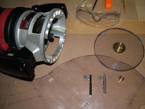 This is the router inlay kit. It comes with four pieces. A large brass ring with a small ring on the bottom. A snap ring/coller, a tool to make sure the brass ring is lined up properly and a 1/8" spiral downcut bit. The first cut on the 1/2" mdf is done without the smaller ring/coller on. This leaves an intermediate pattern that is .19" bigger than the original pattern. Then, using the intermediate pattern, the smaller ring/coller is snapped on and an exact pattern is cut. |