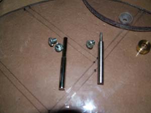 After I made about a 12" cut, the 1/8" spiral downcut router bit broke. That was the end of my work for the day. Here you see all the parts of the router inlay kit. The large part is screwed to the homemade router base. You also see the alignment pin and the broken spiral downcut router bit. ALWAYS wear eye protection when working with any power tools! |