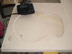 The new guitar mold uses two sheets of plywood. After cutting the first sheet exactly like I want, I cut to within about a half inch of the line on the second sheet of plywood. Then I used a flush trim router bit. I used a wood screw in each corner to hold the sheets together. |