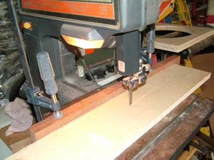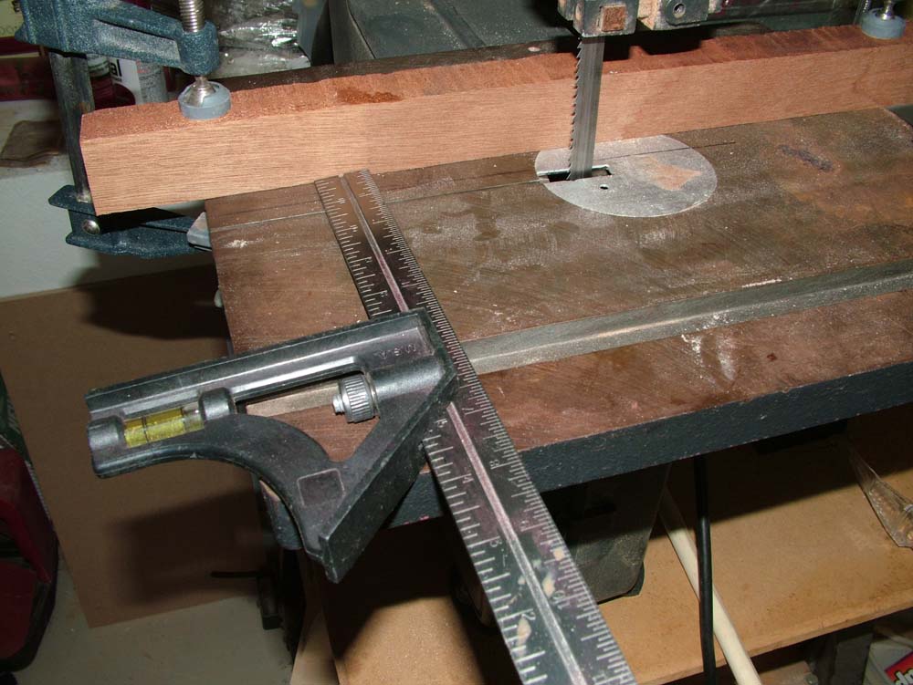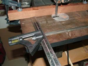 After finishing both sides of the mold, I want to make some blocks that will allow the guitar body to be raised up in the mold. I set up a scrap piece of sapele as a fence on my bandsaw. To set it up, I measure from the edge of the blade to the fence. Then, by placing the square edge of my combination square in the miter slot, I make sure the fence is evenly spaced. |
