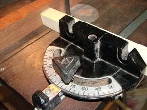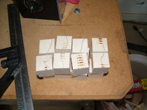 I use a miter gauge to cut the 36" 1" square stock into blocks. Once the fence is set up properly the bocks can be cut accurately and quickly. |