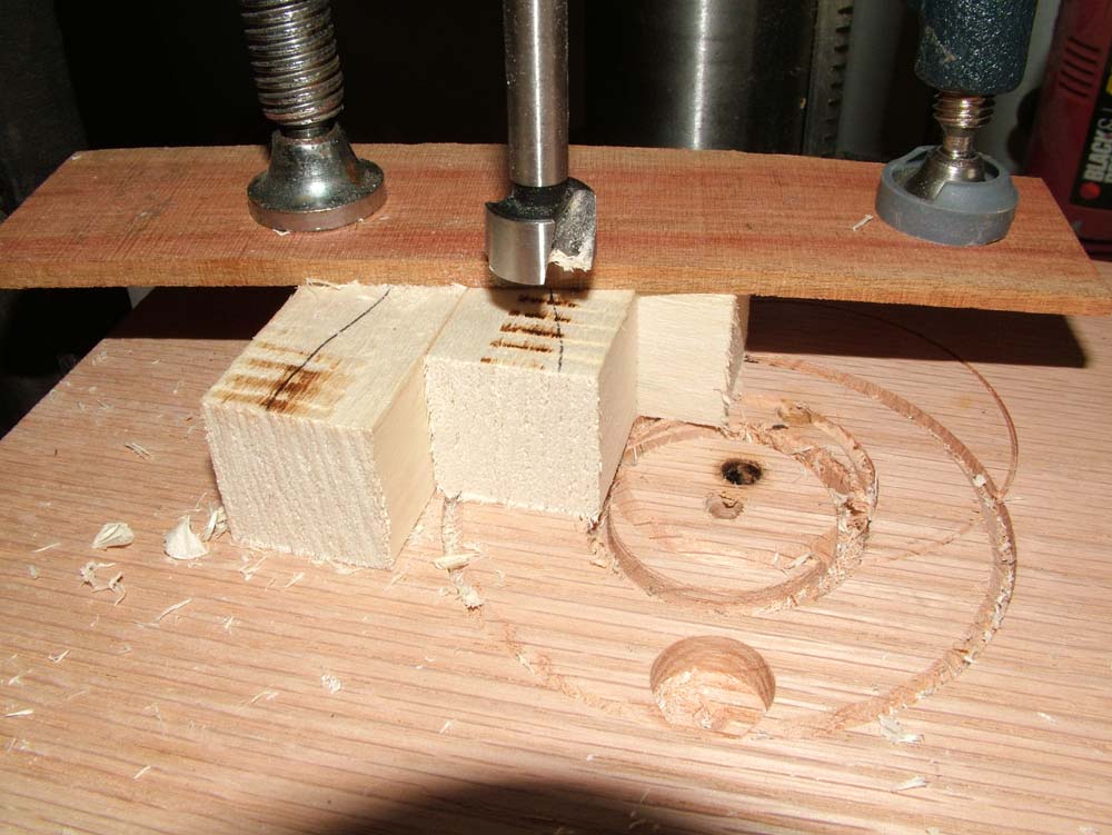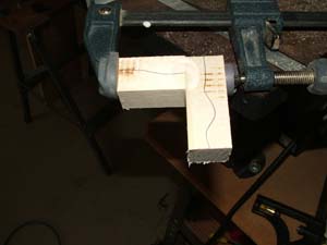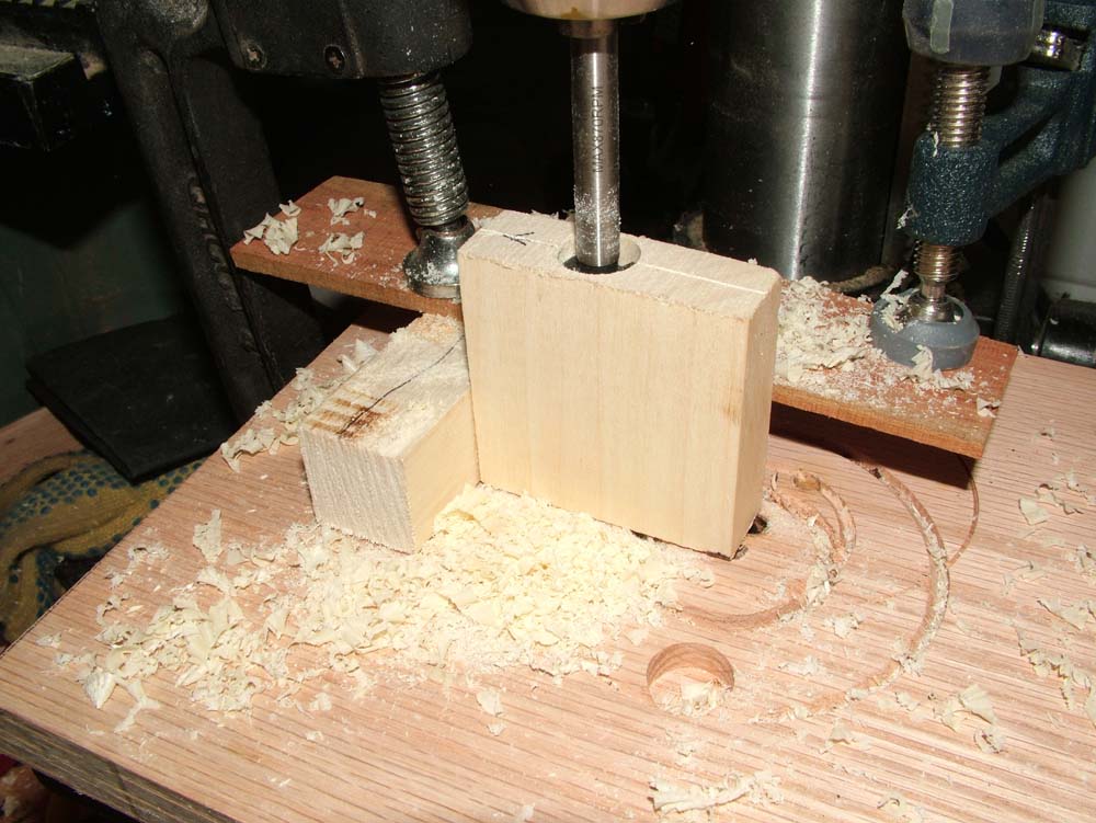 To make sure the hole in each block is exactly the same, I made a jig using the same material I used for the blocks. Here it is glued and clamped. I will clamp this into my drill press and each block will be slipped quickly into position to have the hole for the dowel drilled. |