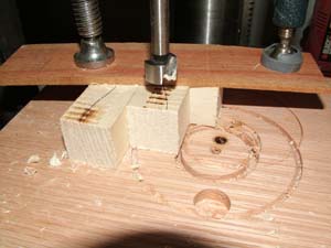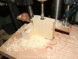 Here is one of the bocks in the jig, on the drill press and ready to be drilled. |