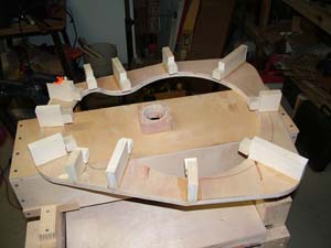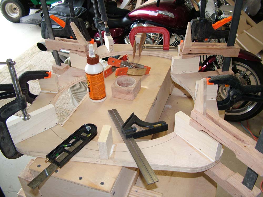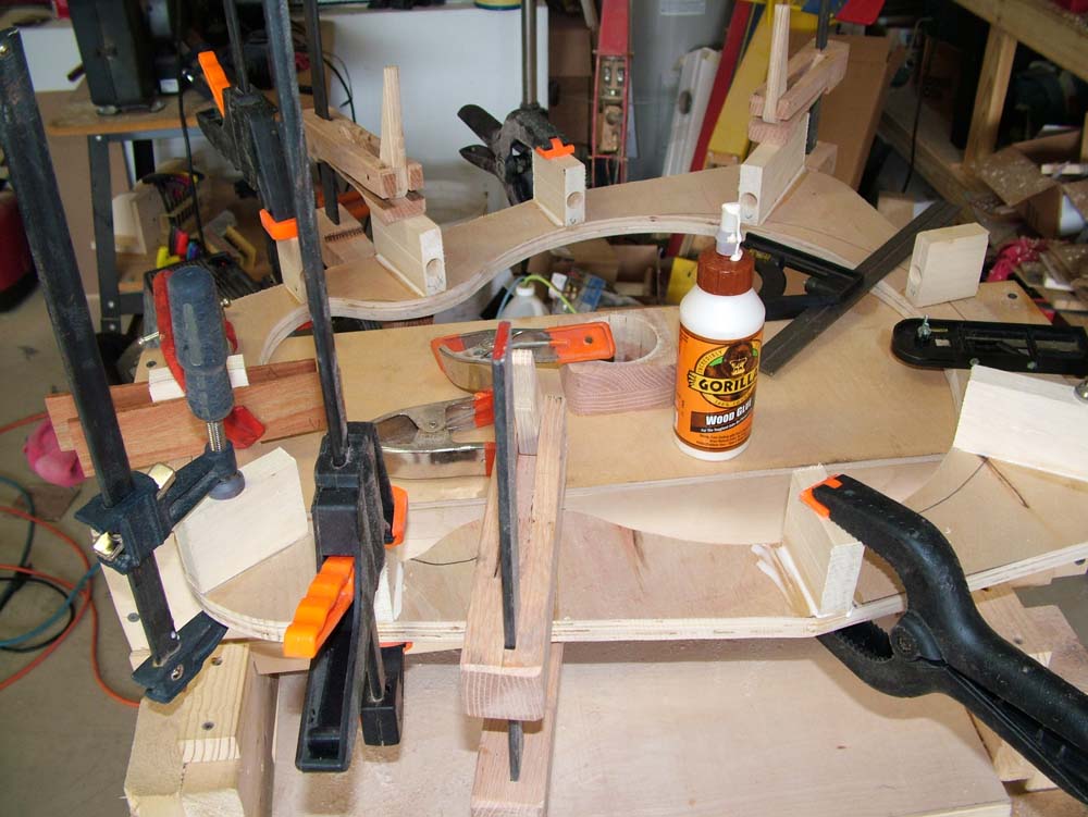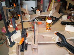 Another view of the mold top with all but one of the spacers glued and clamped in place. You really can never have too many clamps! I've got a few more cam clamps that I need to finish. This took every clamp I had. |