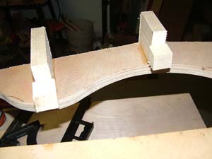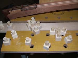 I decide where I want to put a spacer and then cut it to the exact length. Then I use the same jig for the blocks to drill the hole for the blocks. This way the blocks will be in perfect position in the mold and the guitar won't rock because of misplaced blocks. After drilling the holes in the spacers, I glue and clamp them to the top of the mold. |