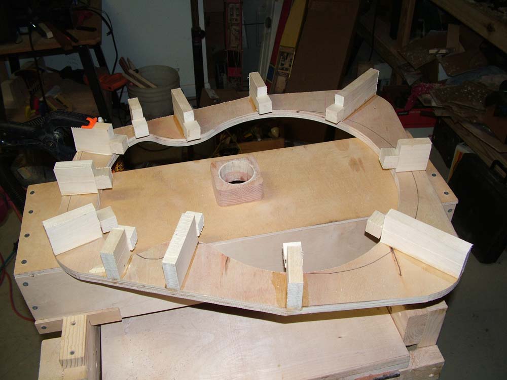 If you have been following my updates, you know that I built a solid guitar mold from MDF, medium density fiberboard. After I got it built I wasn't happy with it. I built it so it will separate in the middle into two sides. The MDF is heavy and it is so soft that it dents easily. After seeing another luthier's molds which were one piece and made of plywood, I decided to build another mold and scrap the first one. I had originally cut a piece of Lexan for a pattern for the body of the guitar. I drew the plans for the guitar in AutoCad and then had them printed locally. I placed the drawing over the Lexan and traced the body shape onto the Lexan. Then I cut to between 1/16" and 1/8" from the line for the body then I sanded the pattern to the exact shape. I ended up cutting the original pattern in half because I wanted to use a router inlay kit to trace the pattern onto a piece of MDF. Well, when I did, twice it broke the router bit. When I decided to build this second mold, I emailed the AutoCad drawing of the guitar to a local plastics company and had them cut me another pattern from acrylic sheet with a CNC (computer numerically controlled) mill. It was only about $40 and the cut is absolutely perfect.
