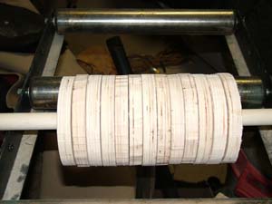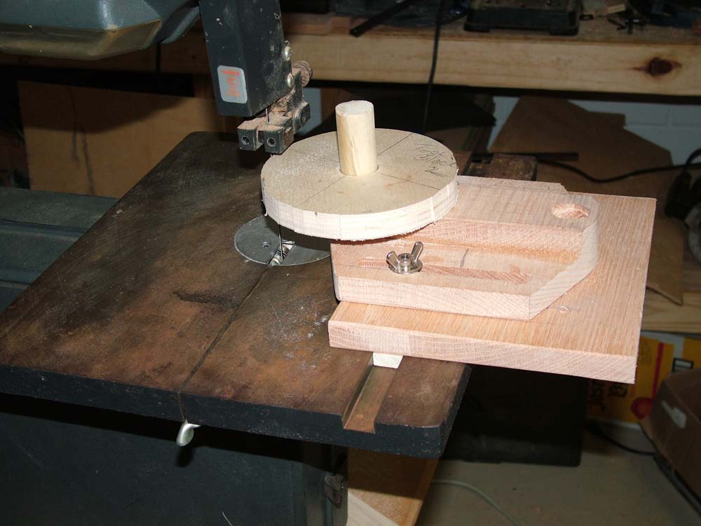 Here, I've cut a disk out of the square of wood. The sanding jig worked great. I make several cuts to round out the wood. When the disks are assembled, I will true them up on the sander base with course sandpaper. |