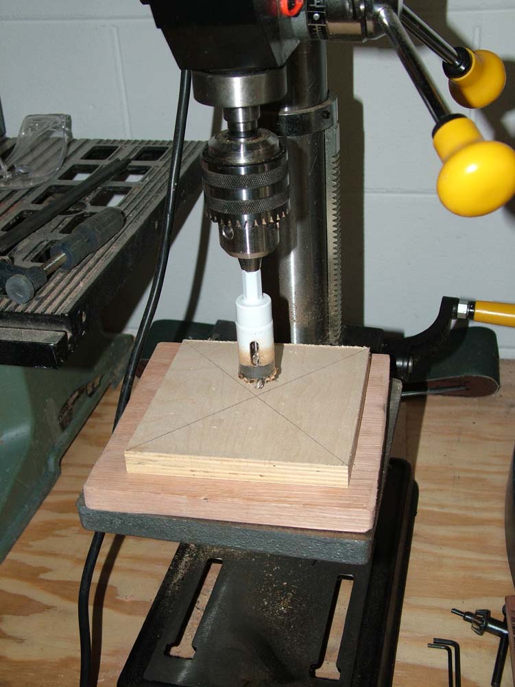After cutting squares of 3/4" plywood 5 1/2" square, I drew a line from each corner diagonally to mark the center of each square. |