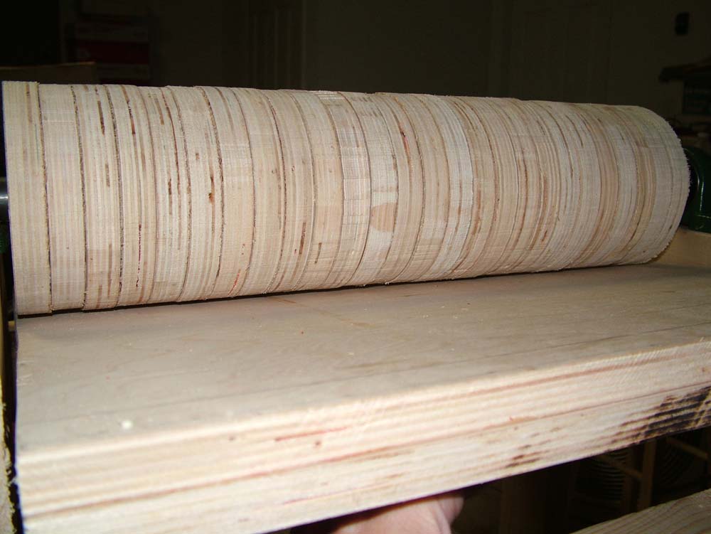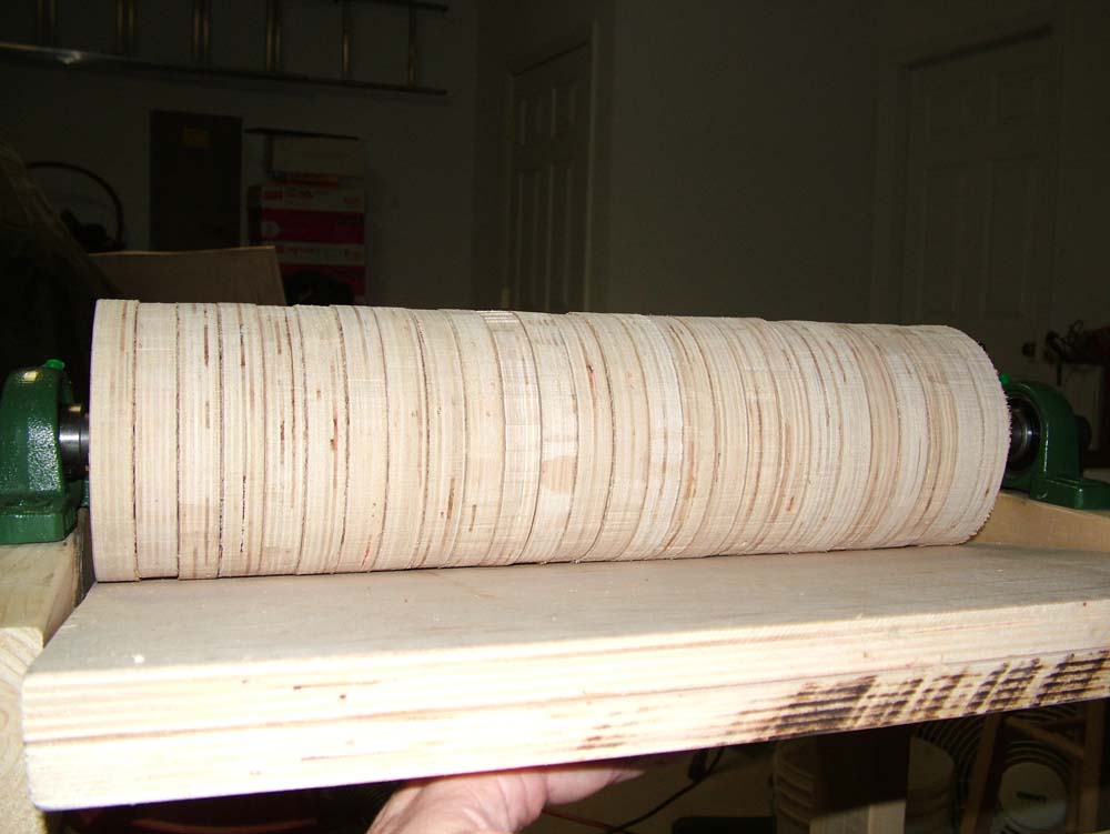By holding the sanding table up to the bottom of the drum, it shows just how evenly the circular disks are rough cut. |