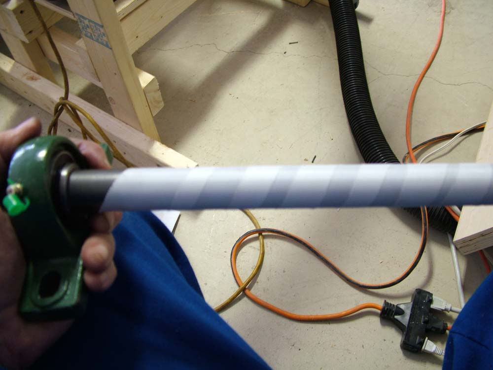 The holes in my wooden disks that make up the sanding drum are a little larger than the shaft. I wrapped the area where the drum will go with cloth medical tape. |