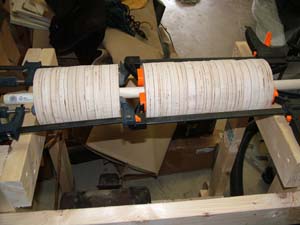 The disks are glued together in five groups of five. I clamped them and allowed them to dry on a 1" dowell. |