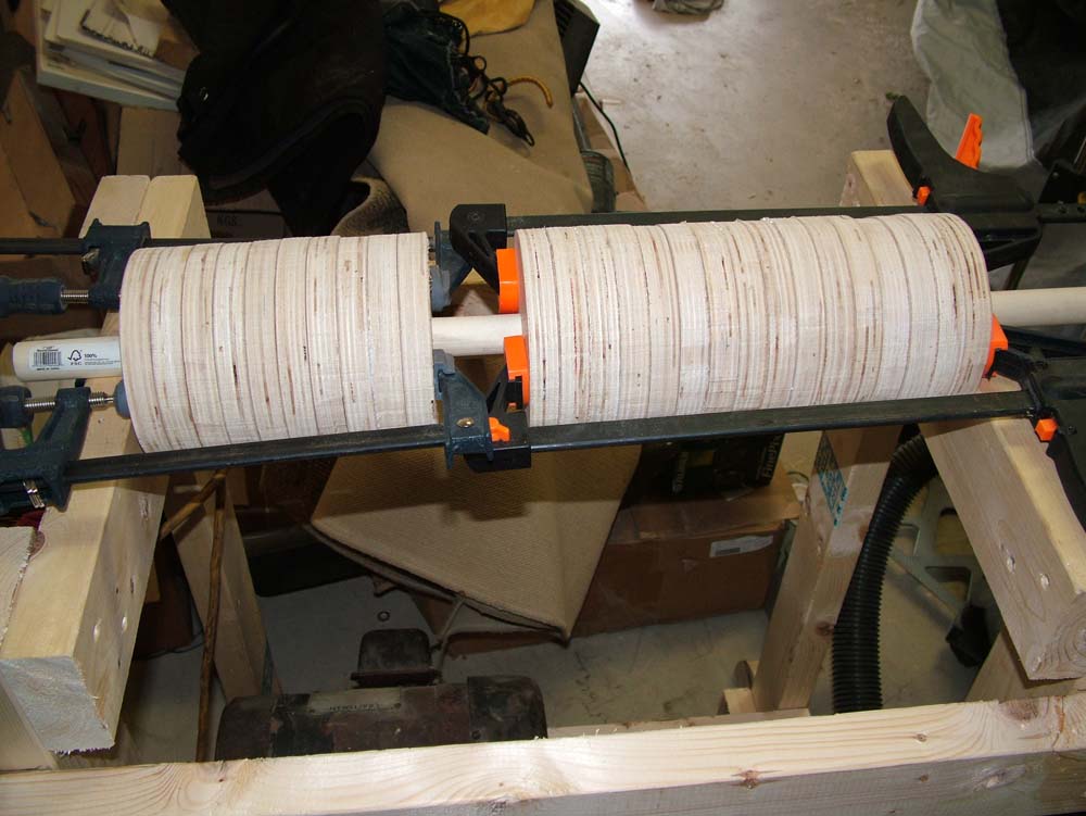 I glued the disks as it shows in the plans for the sander. They recommend gluing the disks in five groups of five disks. Leave a small space between each group for cooling and expansion. I put the disks on a 1" dowell and clamped them while they dry.